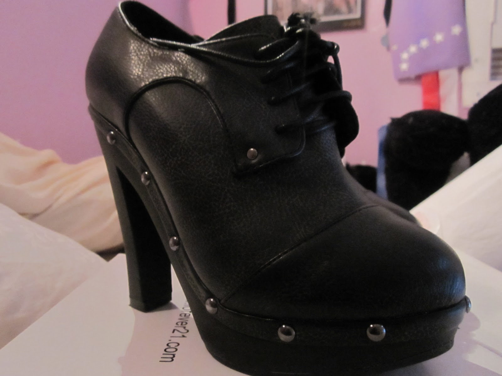 I love me some heels! Too bad I'm sucha baby and I can barely stay in them or let alone walk in them. I am OBSESSED with these heels! Too bad they're way taller than I thought they would be, but that's okay. I be 5' 2" instead of 4' 11" with them on. Yes, I know I am short! I love the lace up look, and the worn out looking leather. The studs are absolutely a plus being that I'm in love with studs also. These heels are PERFECT for me. My sister said these shoes remind her of English men back in the ol` Jane & Tarzan days. Oh geeze.. I love them though! Can't wait to put it together with someone, so watch out for these babies!